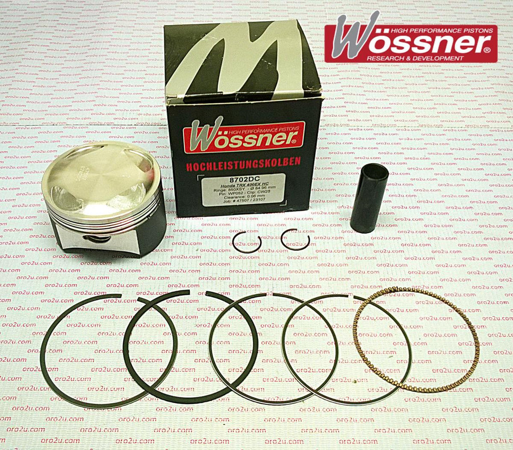 Wössner forged piston kit with an 85.02mm bore, designed for Honda TRX400EX and TRX400X ATVs. Manufactured in Germany, this high-performance piston enhances strength, heat transfer, and durability. The elliptical design ensures uniform bearing surface distribution, reducing localized pressure and preventing piston collapse.