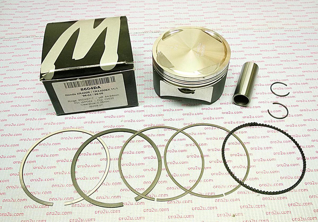 Wössner forged piston kit with an 85mm bore, designed for Honda XR400R motorcycles and TRX400 series ATVs. Manufactured in Germany, this high-performance piston enhances strength, heat transfer, and durability. The elliptical design ensures uniform bearing surface distribution, reducing localized pressure and preventing piston collapse.