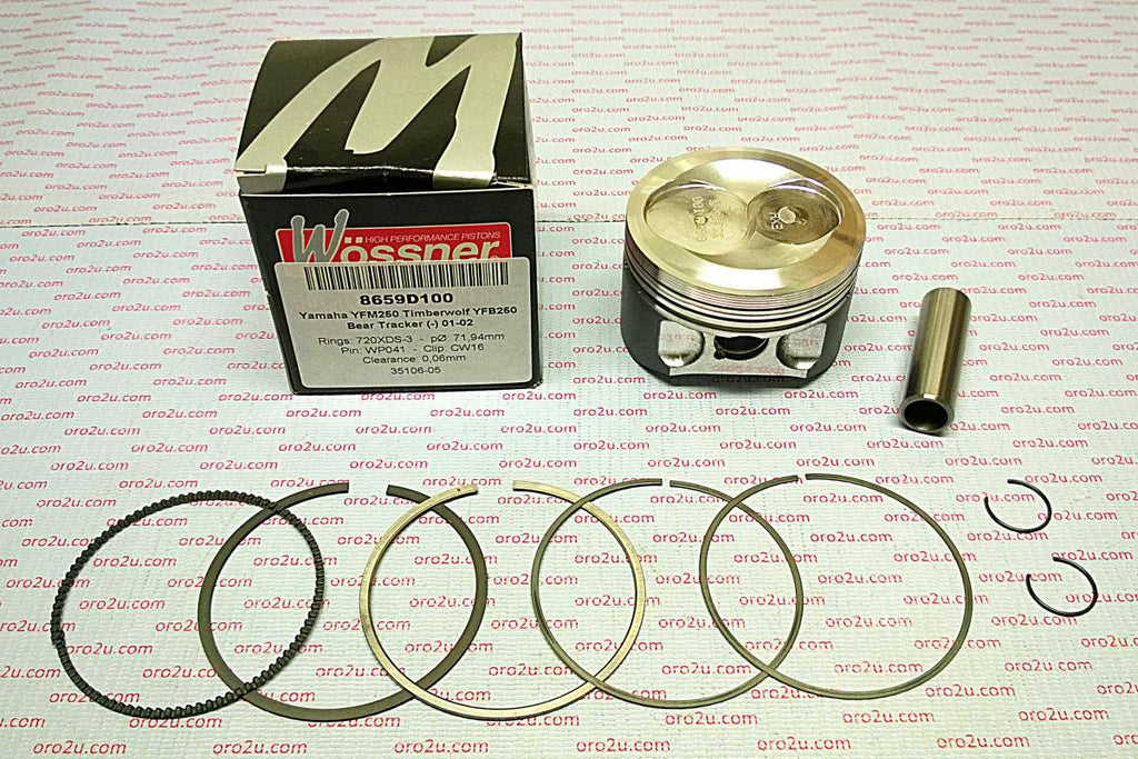 The Wossner 71mm Bore Piston Kit (Part No. 8659DA) is a high-performance forged piston designed for Yamaha YFM250 Timberwolf, YFB250 Bear Tracker, Bruin, and Big Bear models. Engineered for strength and durability, it optimizes heat transfer within the combustion chamber and features an elliptical design to ensure even load distribution, reducing localized pressure and preventing piston collapse. Manufactured in Germany, this piston maintains the OEM compression ratio for reliable engine performance.